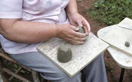 The Catawba people have specific methods they follow to create their pottery. From finding the clay, building the pieces, and burning the pottery they have remained close to the traditional ways with few exceptions being made for technological advances that improve their pottery. Clay for traditional Catawba pottery is dug from clay holes along the banks of the Catawba river. Many of the same clay holes that were used hundreds of years ago are still used today. After the clay is hand processed it is then ready for creating pottery. Catawba pottery is formed completely by hand using several different methods depending on the size of the piece. After the piece is finished, it is left to dry for several days. After it is dry then the potter will begin the detail work by rubbing and scrapping the piece by hand. They use many different tools to do this work from sea shells, smooth rocks from the river, and old snuff cans. Many potters pass their pottery creating tools down to their children and grandchildren. Burnishing or "rubbing" the pots can be a long and tedious process. After the potter is happy with the piece, then it will be fired in an open fire. The potter warms the piece by leaving it outside the fire and then slowly moves it closer and closer until it is put into the fire. The process of firing gives the pottery its distinctive look. The colors come from the clay along with the variety of wood used and the intensity of the fire.